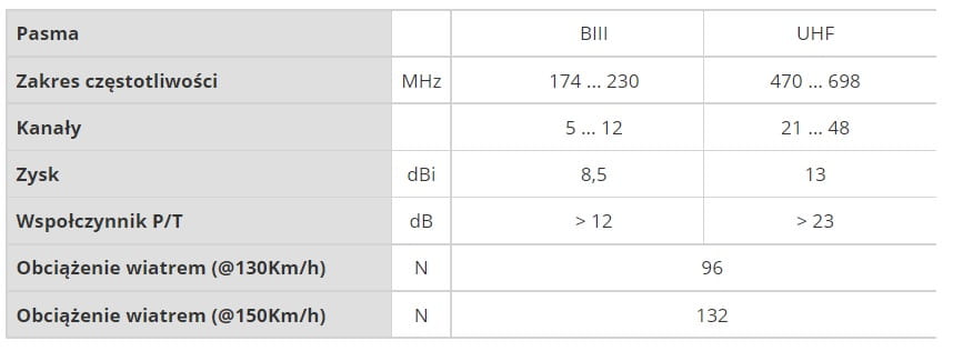 Antena umożliwia odbiór darmowych kanałów telewizji naziemnej DVB-T z pasma UHF (MUX 1, 2, 3) oraz kanałów z pasma VHF, tzw. MUX-8 (nadawanych w polaryzacji poziomej lub pionowej).