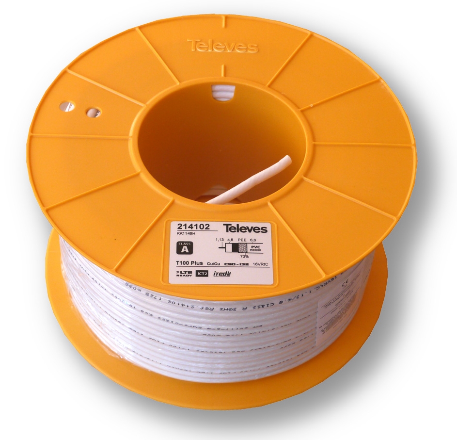 Wysokiej klasy biały pełnomiedziany przewód koncentryczny hiszpańskiej marki Televes o oznaczeniu T100 (nr kat. 214102), używany do systemów odbioru sygnału naziemnego i satelitarnego. Kabel antenowy tej jakości jest idealny do instalacji antenowych pod transmisje kanałów HDTV.