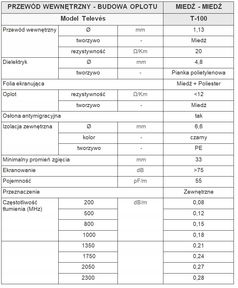 Przewód wewnętrzny kabla Televes T-100 o średnicy 1,13mm wykonany jest z miedzi. Folia ekranująca, jak i oplot kabla wykonany również z miedzi o pokryciu wyższym niż 73% co zapewnia pełną zgodność ze standardem Klasy A. Kabel posiada bardzo dobre parametry tłumiennościowe i można go stosować w instalacjach do 3GHz.