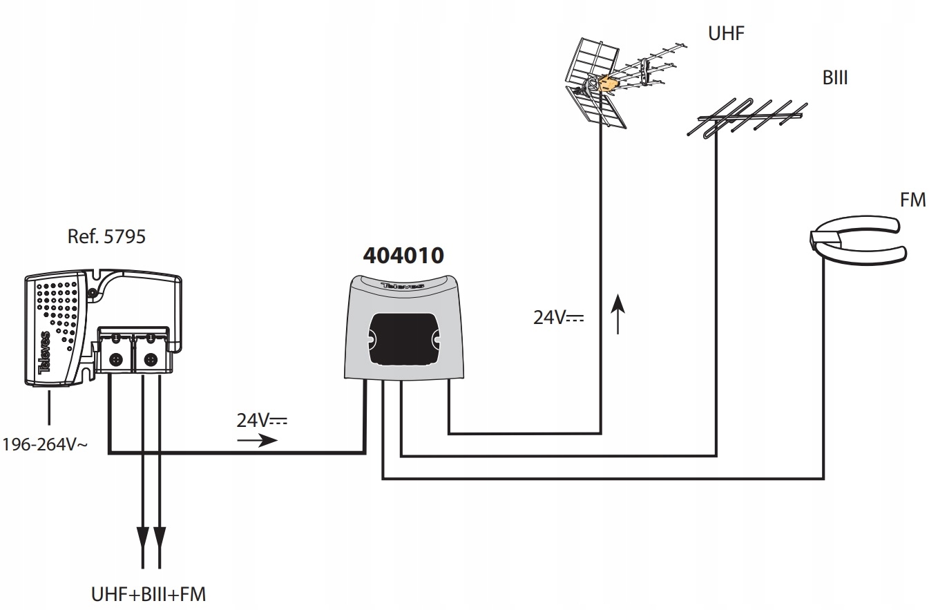 Urządzenie umożliwia przejście zasilania (DC) z wyjścia w kierunku wejścia UHF do zasilania wzmacniacza masztowego lub systemu BOSS. Odpowiednie zasilacze dostępne są w ofercie, np. Televes Picokom.