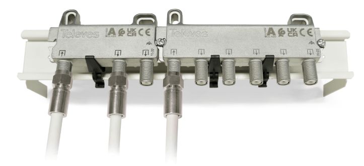 Rozgałęźniki i odgałęźniki Televes z nowej serii można ze sobą łączyć, przykręcić do ściany lub zamocowań na płycie rack z nakrętkami na ich złączach lub na szynie DIN (z adapterem nr kat. 519901).