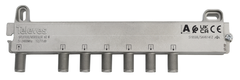 Wysokiej klasy rozgałęźnik 1/6 Televes ref. 519506, czyli 1 wejście, 6 wyjść, pracuje w zakresie 5 MHz - 2400 MHz. Umożliwia podzielenie sygnału telewizji naziemnej DVB-T2 lub kablowej DVB-C na sześć telewizorów. Współpracuje z systemem Unicable w instalacjach satelitarnych opartych o tego typu konwerter i umożliwia podział sygnału Unicable do sześciu dekoderów satelitarnych.