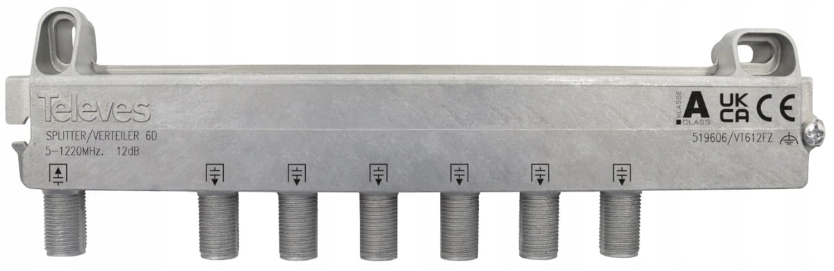 Wysokiej klasy rozgałęźnik 1/6 Televes ref. 519606, czyli 1 wejście, 6 wyjść, pracuje w zakresie 5 MHz - 1218 MHz. Umożliwia podzielenie sygnału telewizji naziemnej DVB-T2 lub kablowej DVB-C na sześć telewizorów.