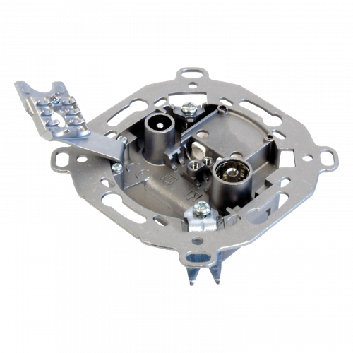Gniazdo końcowe z filtrem rozdzielającym z dwoma złączami IEC. Złącze IEC męskie do FM (radio) i TV naziemnej (strona lewa), złącze IEC żeńskie do TV satelitarnej (IF, strona prawa).