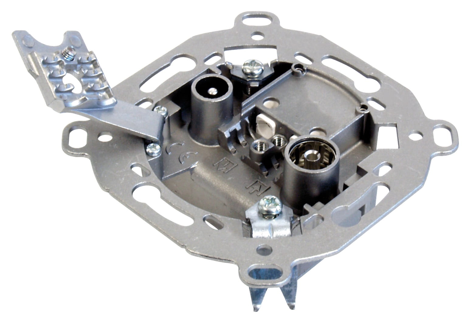 Gniazdo przelotowe wyposażone w dwa złącza IEC - złącze IEC męskie do FM (radio) i TV naziemnej (strona lewa), złącze IEC żeńskie do TV satelitarnej (IF, strona prawa). Umożliwia przejście sygnału i szeregową instalację kilku gniazd. Ponadto, ze względu na tłumienie, gniazdo to jest odpowiednie do instalacji na kondygnacjach 3-5. Zalecana instalacja z gniazdami końcowymi nr kat. 5229xx.
