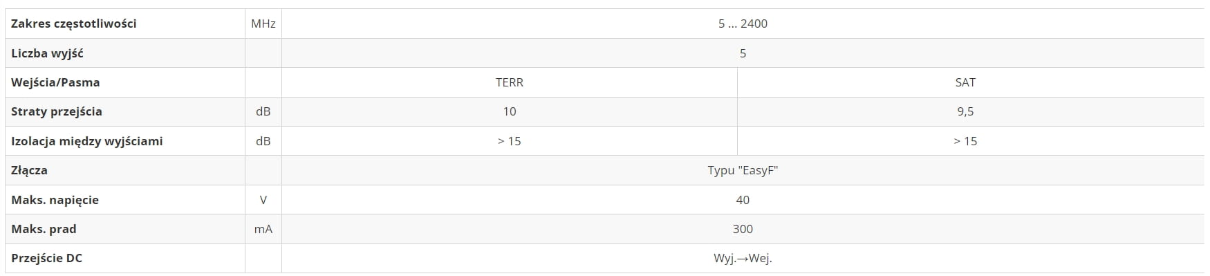 - Starty odgałęzienia: 9,5 dB SAT / 10 dB TERR