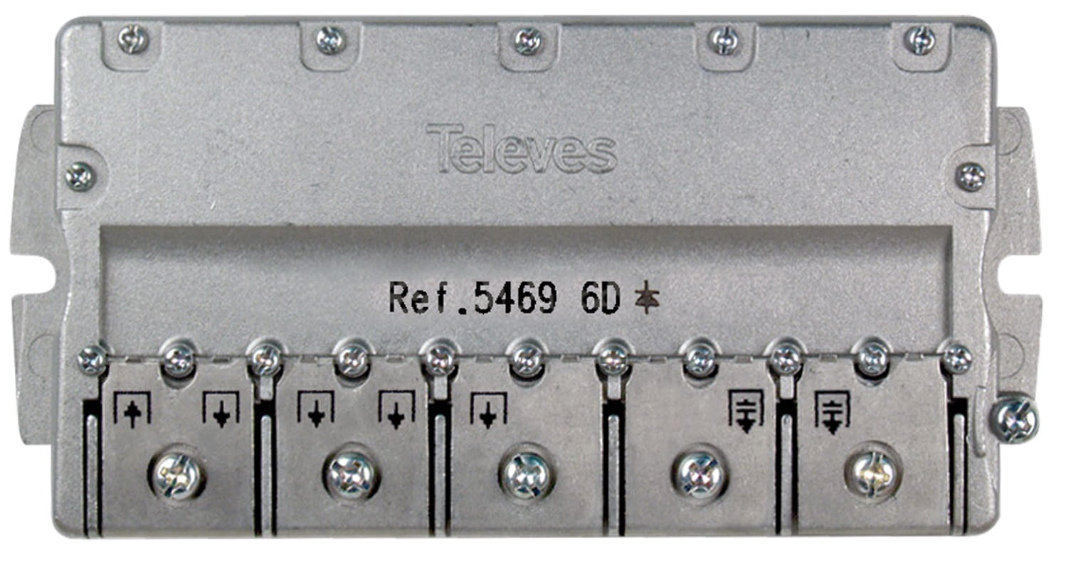 Wysokiej klasy rozgałęźnik 1/6 Televes ref. 5469, czyli 1 wejście, 6 wyjść, pracuje w zakresie 5 MHz - 2400 MHz. Umożliwia podzielenie sygnału telewizji naziemnej DVB-T2 lub kablowej DVB-C na sześć telewizorów. Współpracuje z systemem Unicable w instalacjach satelitarnych opartych o tego typu konwerter i umożliwia podział sygnału Unicable do sześciu dekoderów satelitarnych.