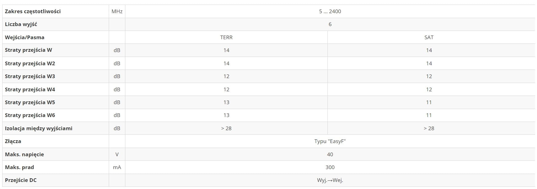 - Starty odgałęzienia SAT: 14dB (W1, W2), 12dB (W3, W4), 11dB (W5, W6)