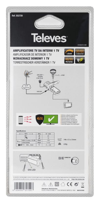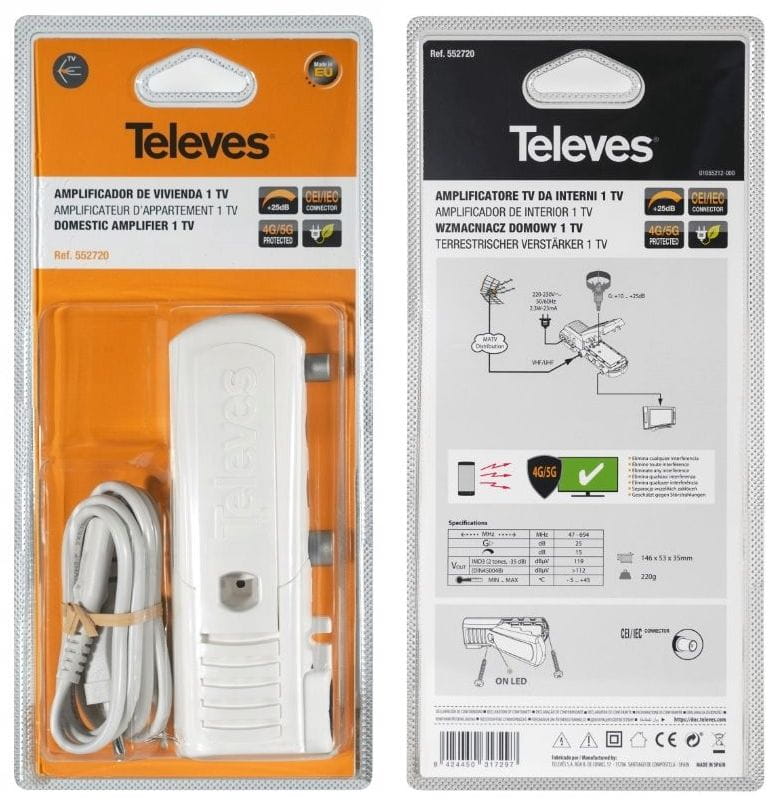 Wzmacniacz Televes posiada wbudowany filtr LTE, dzięki czemu eliminuje efekty sygnałów LTE, zapewniając najlepszą jakość odbioru telewizji naziemnej. Instalacja tego wzmacniacza umożliwia ciągłość jakości usług i prawidłowe funkcjonowanie instalacji, także w sytuacjach gdy instalacja znajduje się w okolicach działania nadajnika LTE 700/4G.