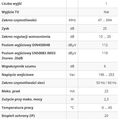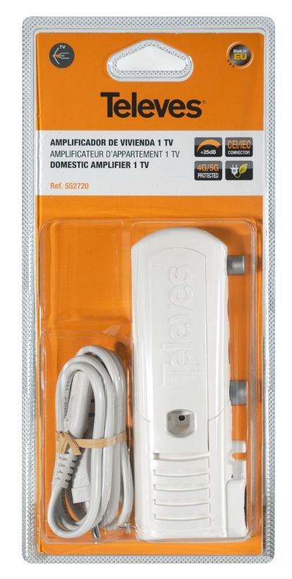 Wzmacniacz Televes 552720 oferuje wzmocnienie do 25dB oraz regulacje wzmocnienia w zakresie 15dB. Praca w zakresie 47...694 MHz pozwala na wykorzystanie go do wzmocnienia sygnału z sieci telewizji kablowej.