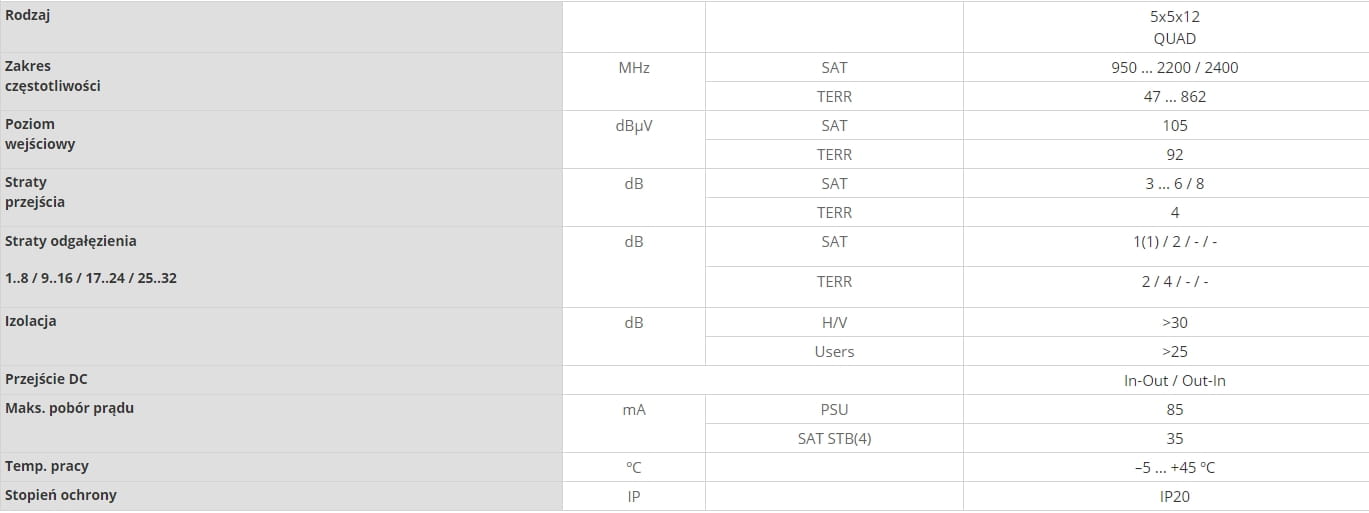 Multiswitch 5/12 rozdziela sygnał niezależnie z 1 konwertera satelitarnego i anteny cyfrowej telewizji naziemnej (dvb-t) na 12 tunerów. W celu wydzielenia sygnału satelitarnego i anten lokalnych trzeba zastosować gniazda końcowe TV/Sat (dostępne w naszej ofercie).