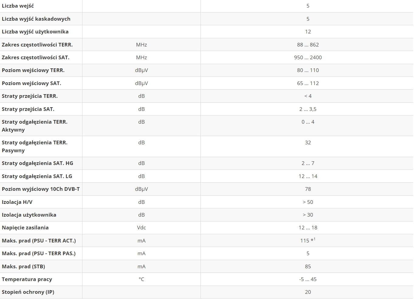 Multiswitch 5/5/12 rozdziela sygnał niezależnie z 1 konwertera satelitarnego i anteny cyfrowej telewizji naziemnej (dvb-t2) na 12 tunerów. W celu wydzielenia sygnału satelitarnego i anten lokalnych trzeba zastosować gniazda końcowe TV/Sat (dostępne w naszej ofercie).