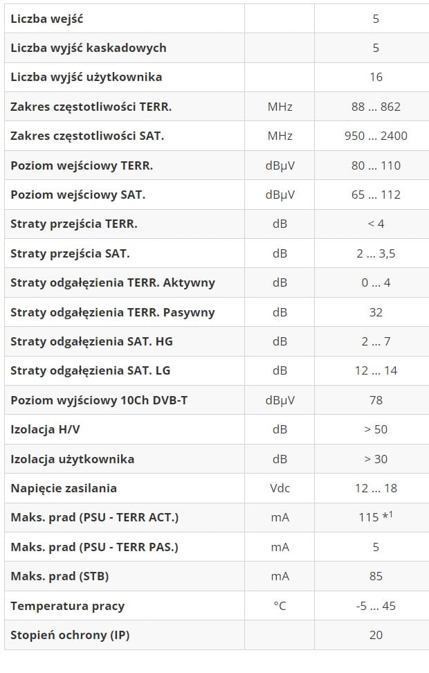 Multiswitch 5/5/16 rozdziela sygnał niezależnie z 1 konwertera satelitarnego i anteny cyfrowej telewizji naziemnej (dvb-t2) na 16 tunerów. W celu wydzielenia sygnału satelitarnego i anten lokalnych trzeba zastosować gniazda końcowe TV/Sat (dostępne w naszej ofercie).