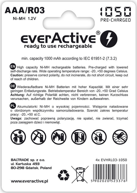 Rzeczywista pojemność akumulatorów everActive jest zgodna z deklaracjami na akumulatorze/blistrze - zgodnie z międzynarodową normą IEC 61951-2 (7.3.2).