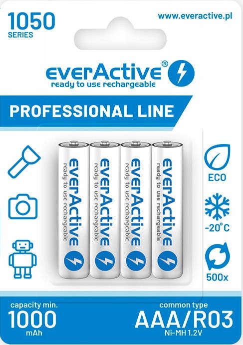 Idealne dla wymagających zabawek, latarek, reflektorów, aparatów cyfrowych, czy odtwarzaczy CD/MP3, a nawet zegarków, pilotów itp. Pojemność akumulatorów everActive jest zbliżona do baterii alkalicznych, ale można je wielokrotnie ładować (nawet do 500x). Ponadto akumulatory dużo lepiej znoszą rozładowanie dużym prądem. Są to niezwykle trwałe akumulatory o zwiększonej żywotności, cechuje je wysoka powtarzalność parametrów.