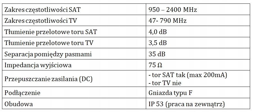 Zwrotnica (sumator) sygnału satelitarnego i telewizji naziemnej DVB-T. Urządzenie przeznaczone do montażu wewnątrz jak i na zewnątrz budynku (w zestawie obudowa umożliwiająca montaż bezpośrednio na maszcie, przy antenach). Sumuje częstotliwości 950-2400 MHz (satelitarna) z częstotliwościami 47-790 MHz (TV naziemna i radiowa).