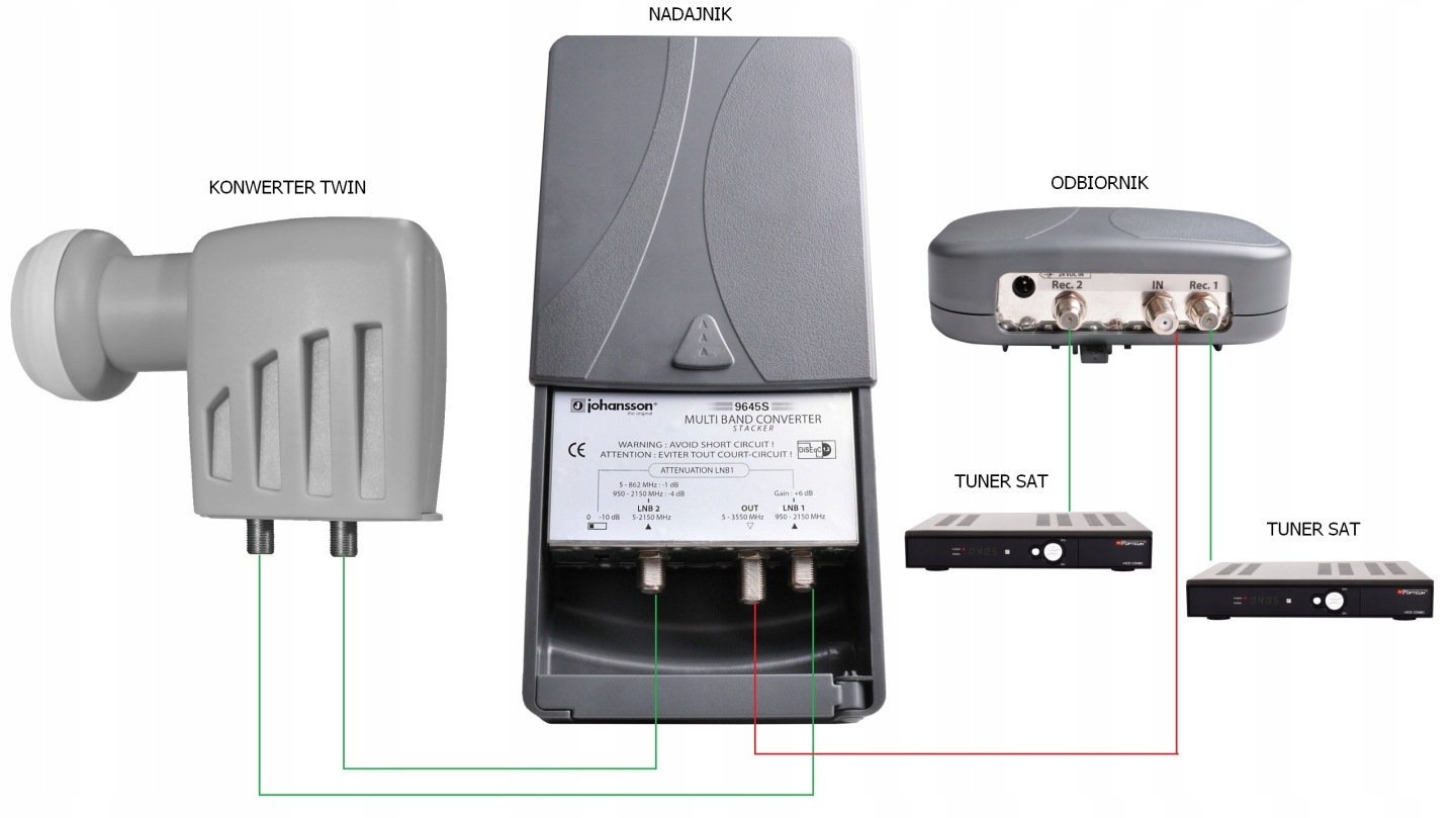 W zestawie znajduje się nadajnik, do którego można podłączyć dwa przewody z sygnałem satelitarnym i przesłać dalej jednym kablem. Na końcu instalacji, przy dekoderze montuje się odbiornik, którego zadaniem jest rozsumowanie sygnału i przekazanie go dwoma kablami do końcowego urządzenia (tunera satelitarnego, multiswitcha, itp.).