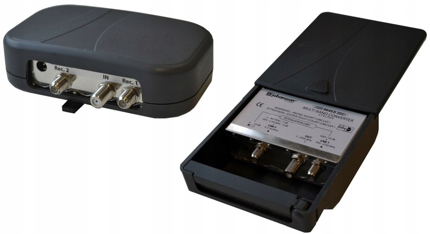 Multiband Converter Johansson 9645 KIT to urządzenie, które umożliwia przesłanie dwóch sygnałów satelitarnych jednym kablem. Dzięki temu rozwiązaniu można wykorzystać istniejąca instalację bez konieczności prowadzenia dodatkowego kabla. Zalecane do stosowania w połączeniu z odbiornikiem (podwójne wejścia PVR) lub dwóch oddzielnych odbiorników (pojedyncze wejścia). Nie wymaga dodatkowego zasilania, pobierane jest z tunera satelitarnego.