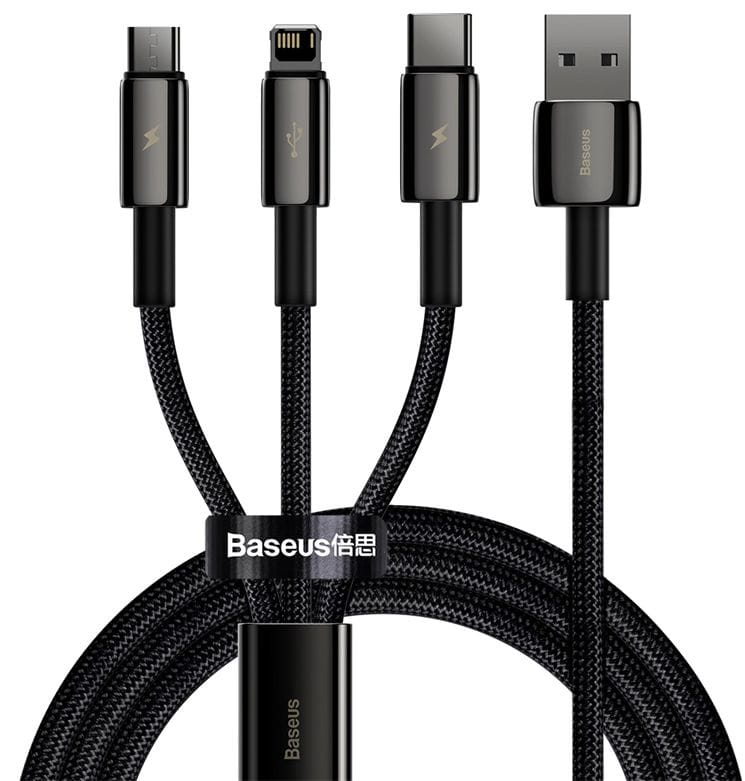 Uniwersalny kabel USB marki Baseus 3w1 ze złączem 8-PIN. Kabel posiada trzy złącza Micro USB / USB typ-C / 8-pin, dzięki czemu jednym kablem możesz ładować wiele różnych urządzeń z jednego źródła mocy. Duży amperaż (3,5 A) zapewnia funkcję szybkiego ładowania 'Fast Charge'.