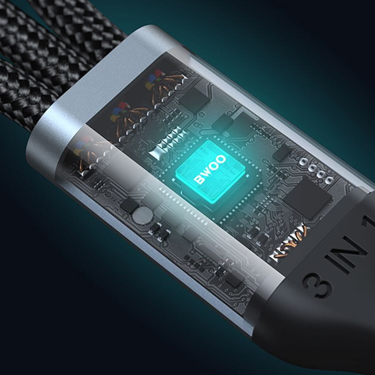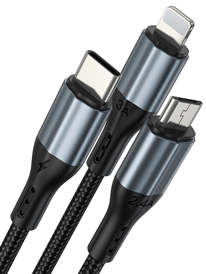 Kabel pozwala na szybkie ładowanie trzech urządzeń jednocześnie bez spowolnienia. Zarówno Lightning, jak i Type-C obsługują szybkie ładowanie 3A, a Micro USB dostarcza prąd o wartości 2,4A.
