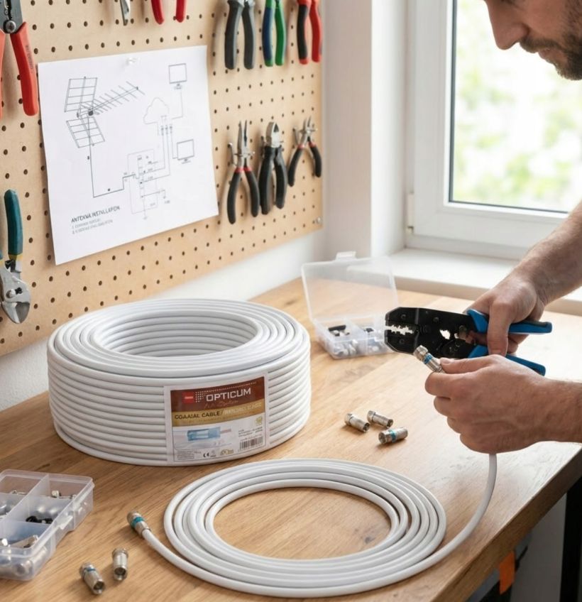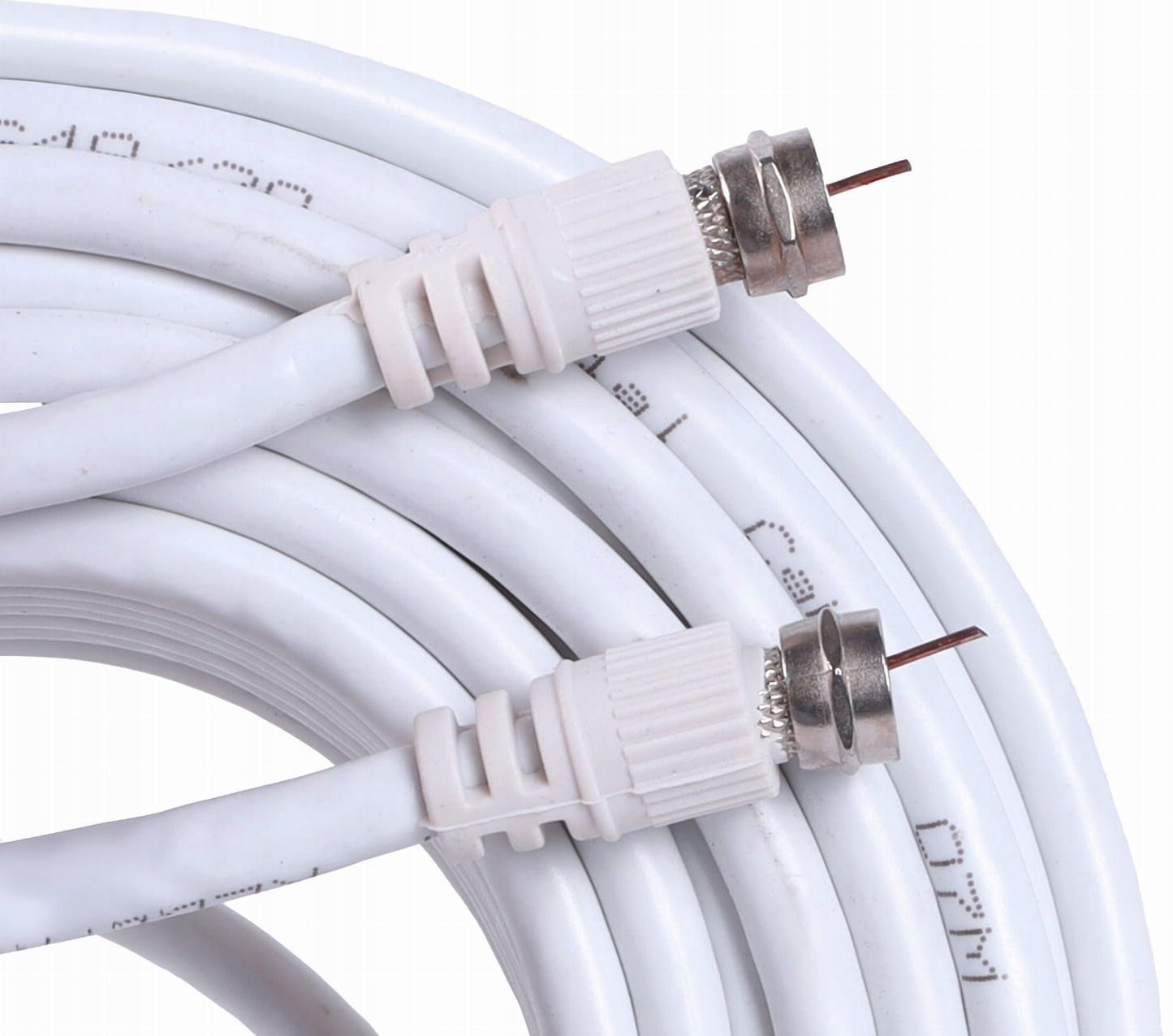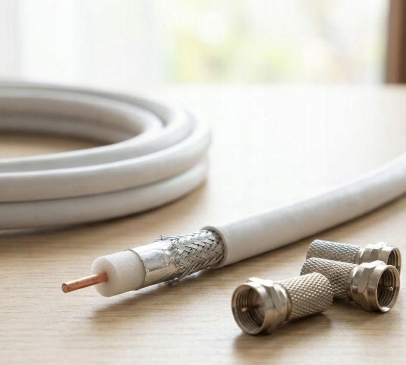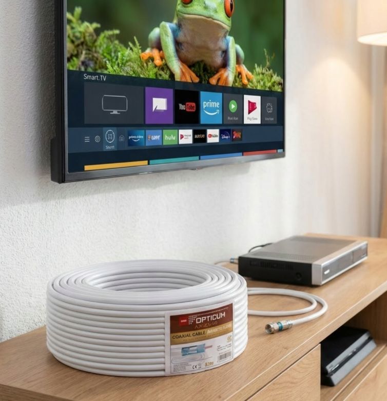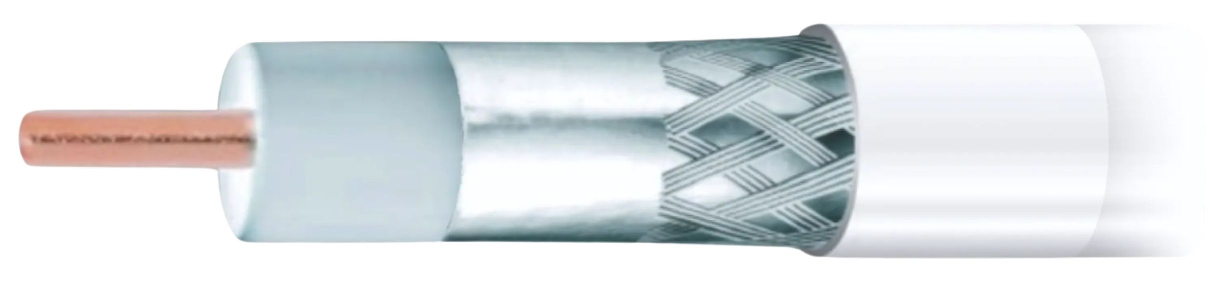 Wysokiej jakości, potrójnie ekranowany biały przewód koncentryczny typu RG6, o żyle wewnętrznej wykonanej z drutu miedzianego o średnicy 1,02 mm.