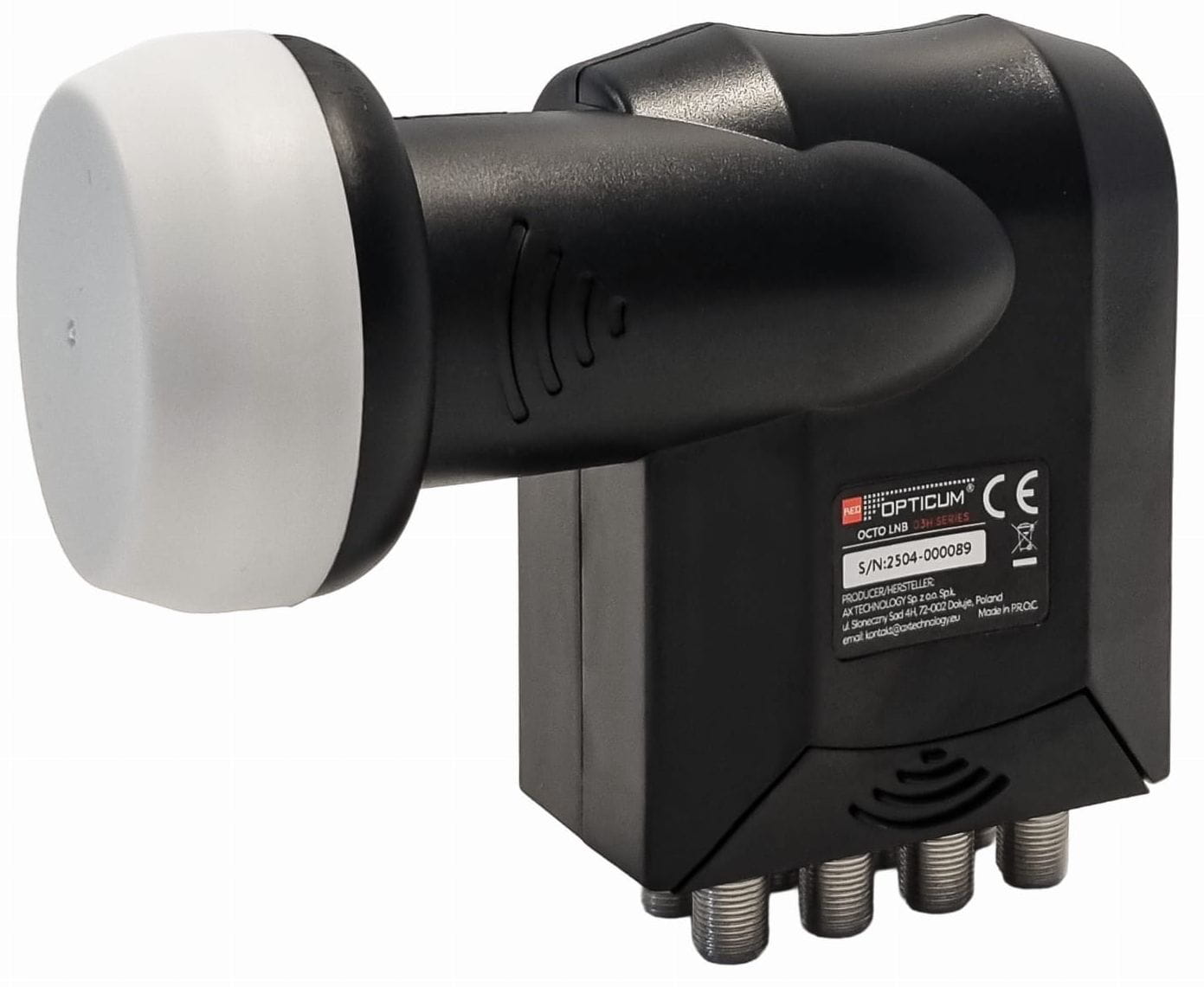 Wysokiej jakości konwerter marki Opticum. Konwerter typu OCTO służy do odbioru sygnału z jednego satelity, posiada osiem niezależnych wyjść pozwalających na podłączenie ośmiu tunerów pojedynczych (jednogłowicowych), lub czterech tunerów dwugłowicowych PVR. Posiada osłonę przeciwdeszczową.