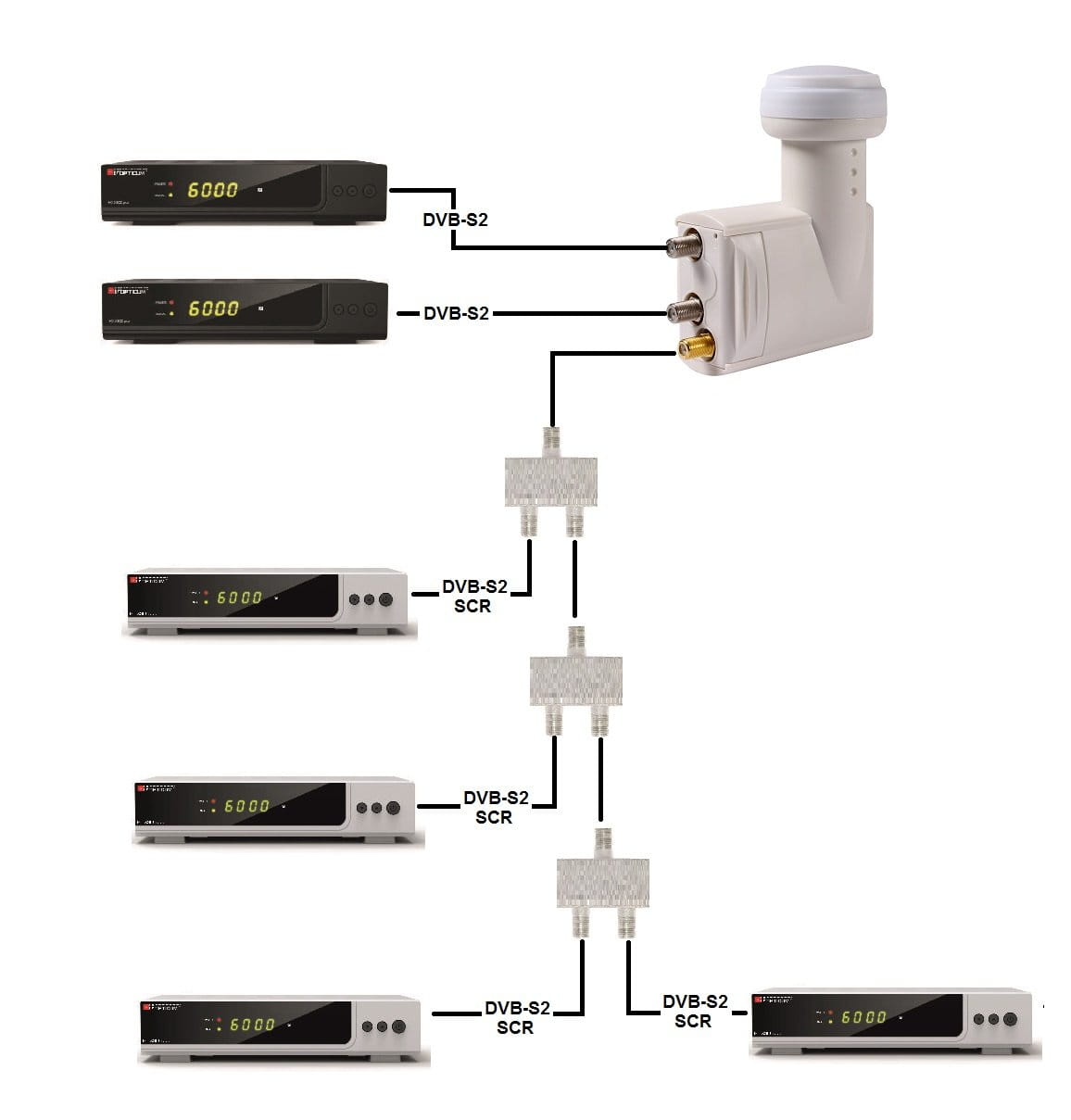 Pozwala to na jednoprzewodową (szeregową) transmisję sygnału do max. 4 odbiorników z oznaczeniem Unicable w menu oraz z dwóch wyjść typu Universal do dwóch niezależnych tunerów, czyli w sumie może obsłużyć do 6 tunerów satelitarnych.