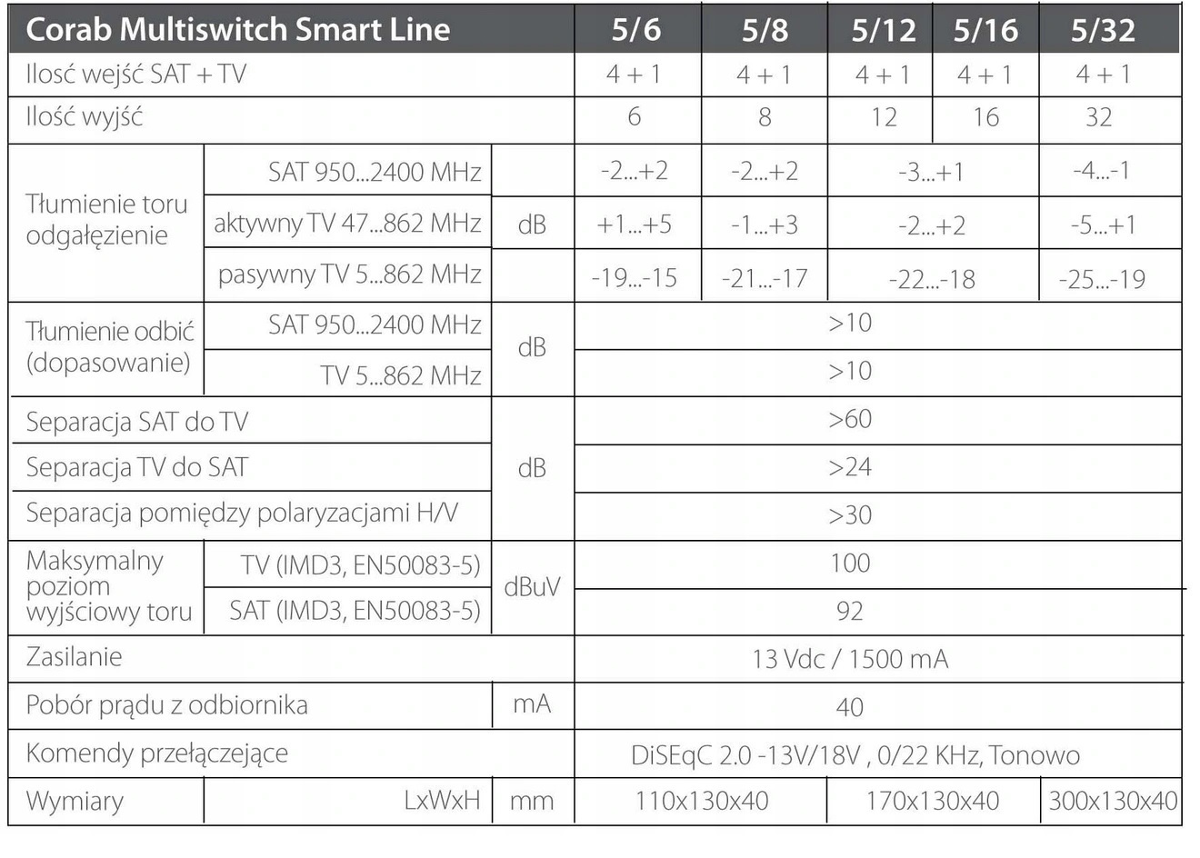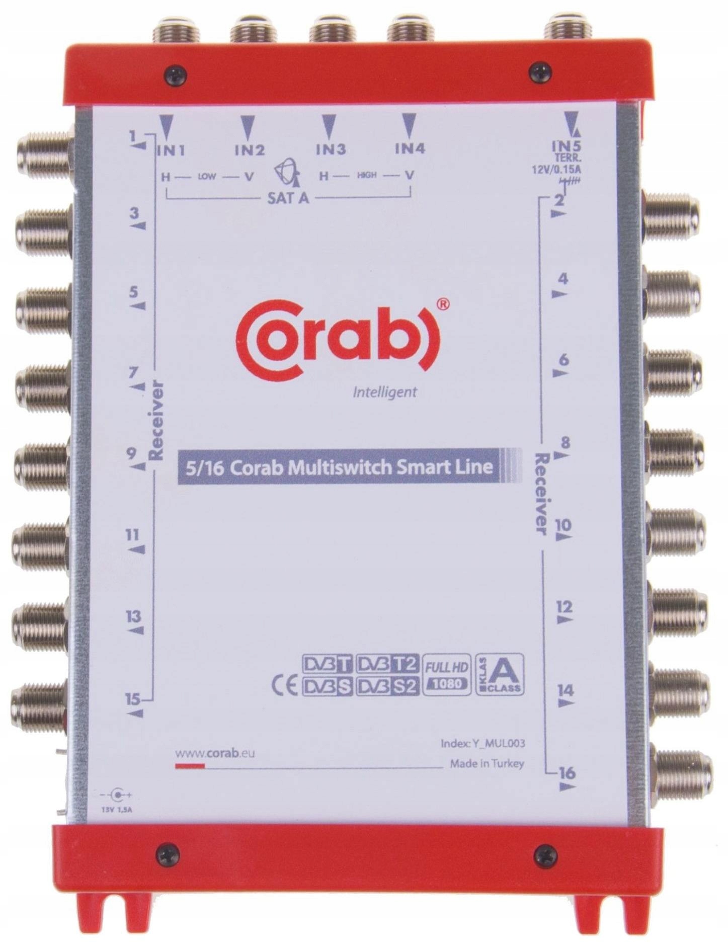 Multiswitch Corab 5/16 Smart Line z 4 wejściami satelitarnymi dla jednego konwertera Quattro i 1 wejściem z anteny telewizji naziemnej (dvb-t) umożliwia dystrybucję sygnału do 16 gniazd abonenckich TV SAT (gniazda są dostępne w naszej ofercie).