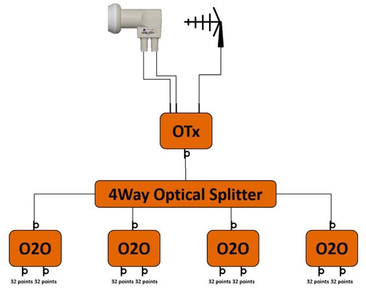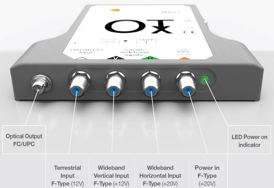 OTx posiada 3 wejścia, z których 2 przeznaczone są do sygnału z satelity, a 1 do sygnału naziemnego DVB-T/T2, DVB-C lub DAB+ ( 88 MHz – 694 MHz). Do konwertera szerokopasmowego Wide Band potrzebne są tylko 2 kable od anteny satelitarnej do OTx, co umożliwia umieszczenie VH i VL na jednym koncentryku, a HH i HL na drugim.