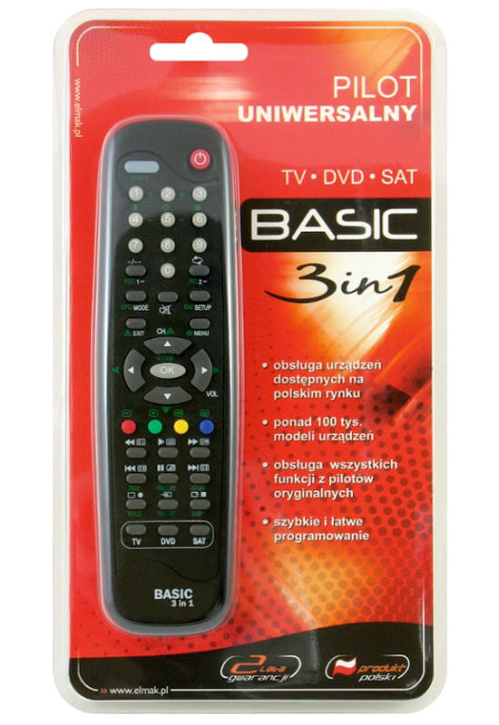 Wielofunkcyjny, uniwersalny pilot Basic 3w1, którego producentem jest znany polski producent Elmak może obsługiwać jednocześnie 3 urządzenia: telewizor, tuner satelitarny lub dekoder płatnej telewizji cyfrowej, sprzęt DVD.