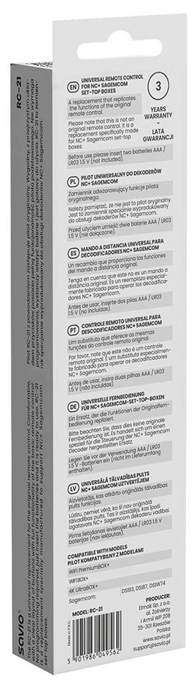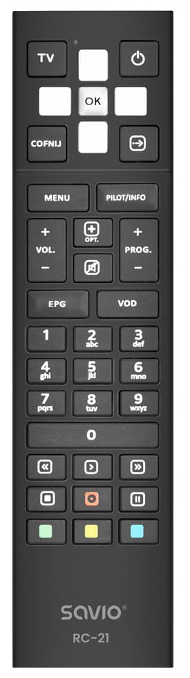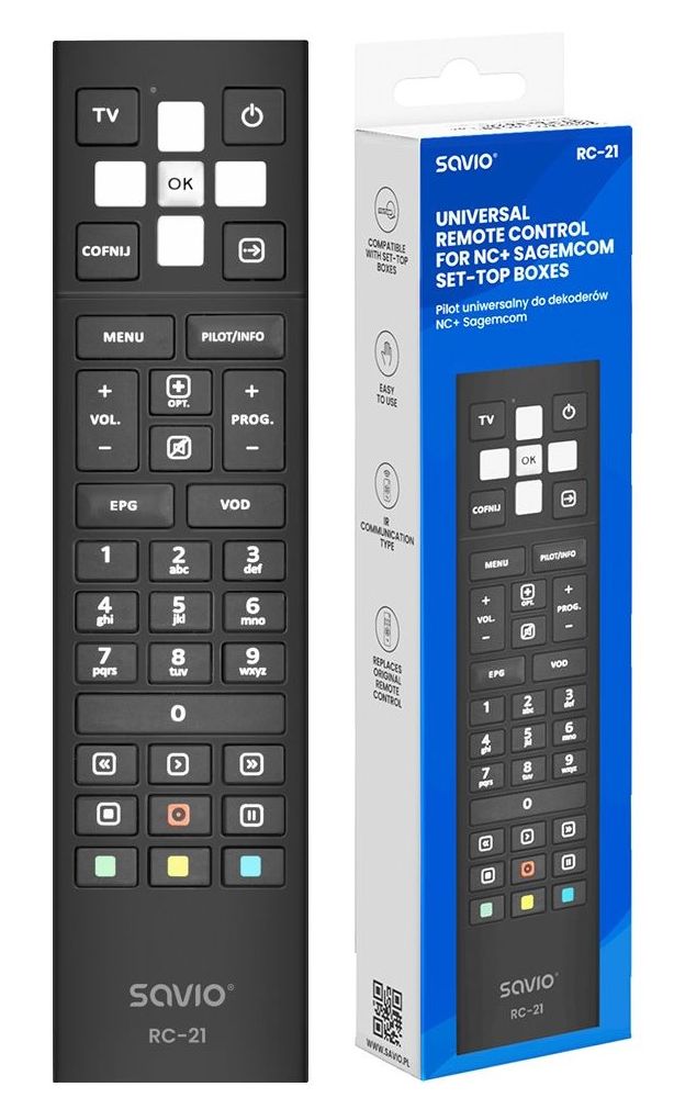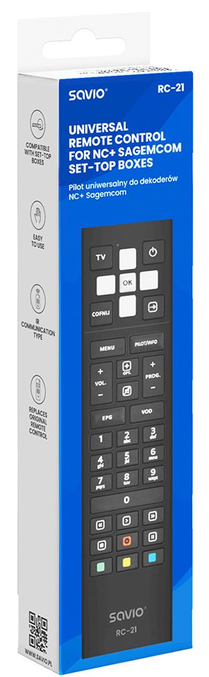 RC-21 to wygodne w użytkowaniu uniwersalne urządzenie dedykowane do obsługi dekodera NC+ Sagemcom. Doskonale sprawdzi się jako zamiennik pilota oryginalnego dzięki odwzorowaniu pełnej funkcjonalności. Łączy w sobie prostotę obsługi, funkcjonalność i atrakcyjną cenę, oferując wygodny sposób zarządzania najważniejszymi funkcjami telewizora.