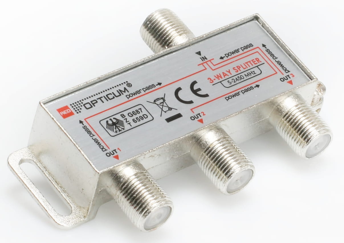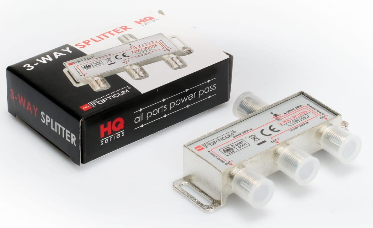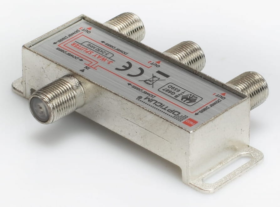 Splitter (rozgałęźnik) sygnału 1/3 posiada 1 wejście i 3 wyjścia, zakres pracy 5-2400 MHz. Umożliwia przejście napięcia DC.