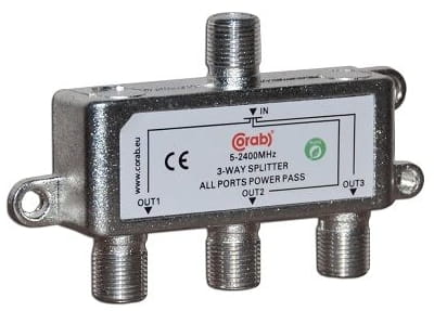 Splitter (rozgałęźnik) sygnału 1/3 posiada 1 wejście i 3 wyjścia, zakres pracy 5-2400 MHz. Umożliwia podzielenie sygnału telewizji satelitarnej (unicable), naziemnej lub kablowej na trzy odbiorniki.