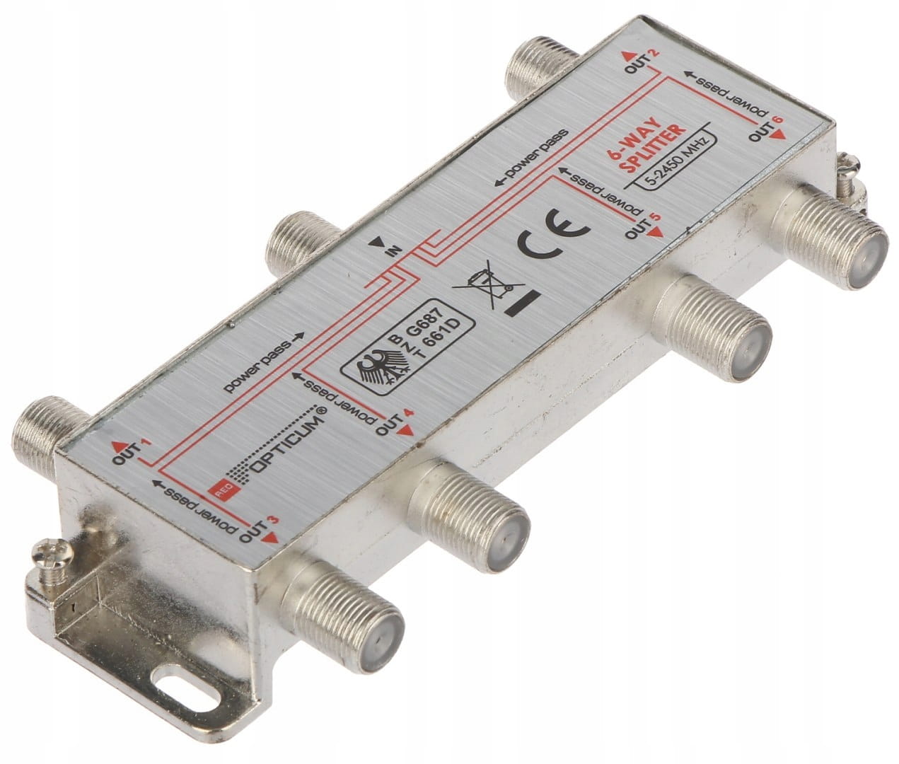 Splitter (rozgałęźnik) sygnału 1/6 posiada 1 wejście i 6 wyjść, zakres pracy 5-2400 MHz. Umożliwia podzielenie sygnału telewizji satelitarnej (unicable), naziemnej lub kablowej na sześć odbiorników. Umożliwia przejście napięcia DC.