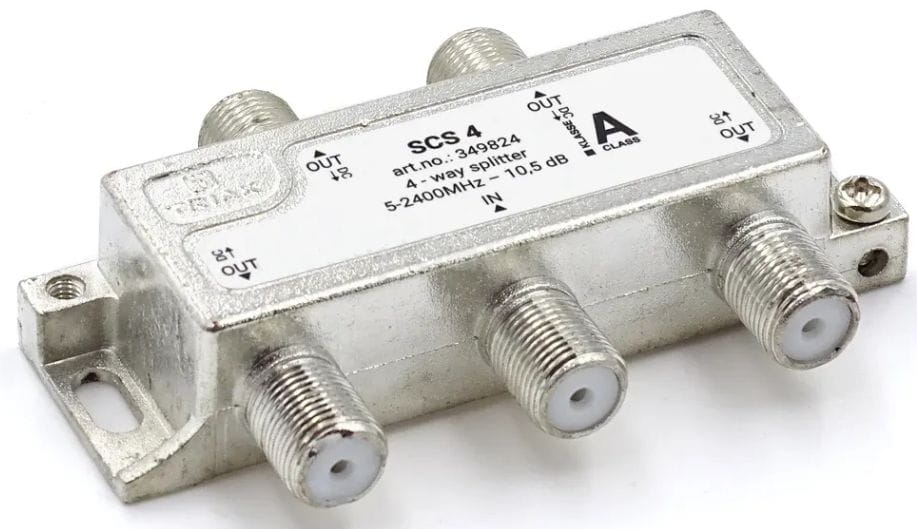 Splitter (rozgałęźnik) sygnału telewizyjnego i radiowego 1/4 posiada 1 wejście i 4 wyjścia, zakres pracy 5-2400 MHz. Umożliwia podzielenie sygnału telewizji satelitarnej (unicable), naziemnej lub kablowej na cztery odbiorniki. Umożliwia przejście napięcia DC z zasilacza do przedwzmacniacza montowanego w antenie.