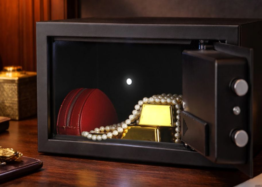 Po otwarciu drzwi włącza się podświetlenie LED wnętrza, które pozostaje aktywne przez 25 sekund. To praktyczny detal, który ułatwia korzystanie z sejfu przy słabszym oświetleniu.