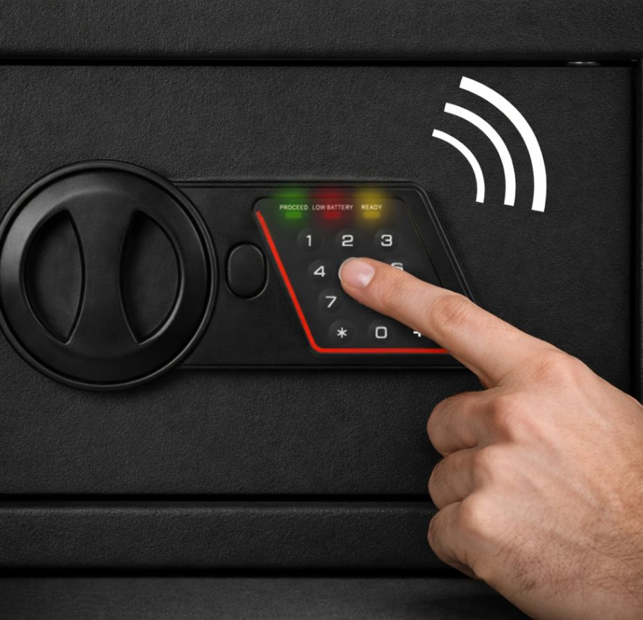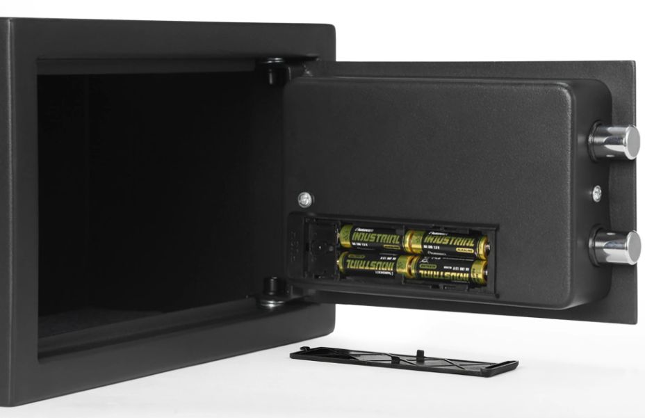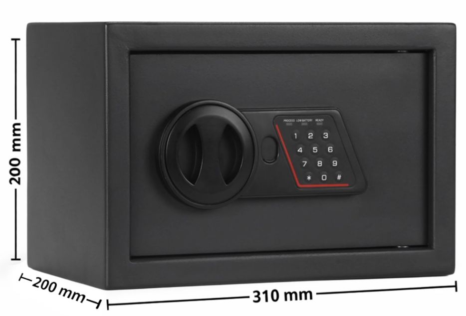 Zamek elektroniczny z 3-8 cyfrowym kodem dostępu do wielokrotnego programowania, blokada klawiatury po trzecim błędnym wprowadzeniu kodu, świetlna i dźwiękowa sygnalizacja wprowadzenia kodu, błędnego wyboru kodu oraz słabych baterii zasilających. Po zablokowaniu panelu cyfrowego sejf można otwarzyć za pomocą kluczyka, załączonego do zestawu. W ofercie posiadamy również sejfy biometryczne, umożliwiające otwieranie na odcisk palca.
