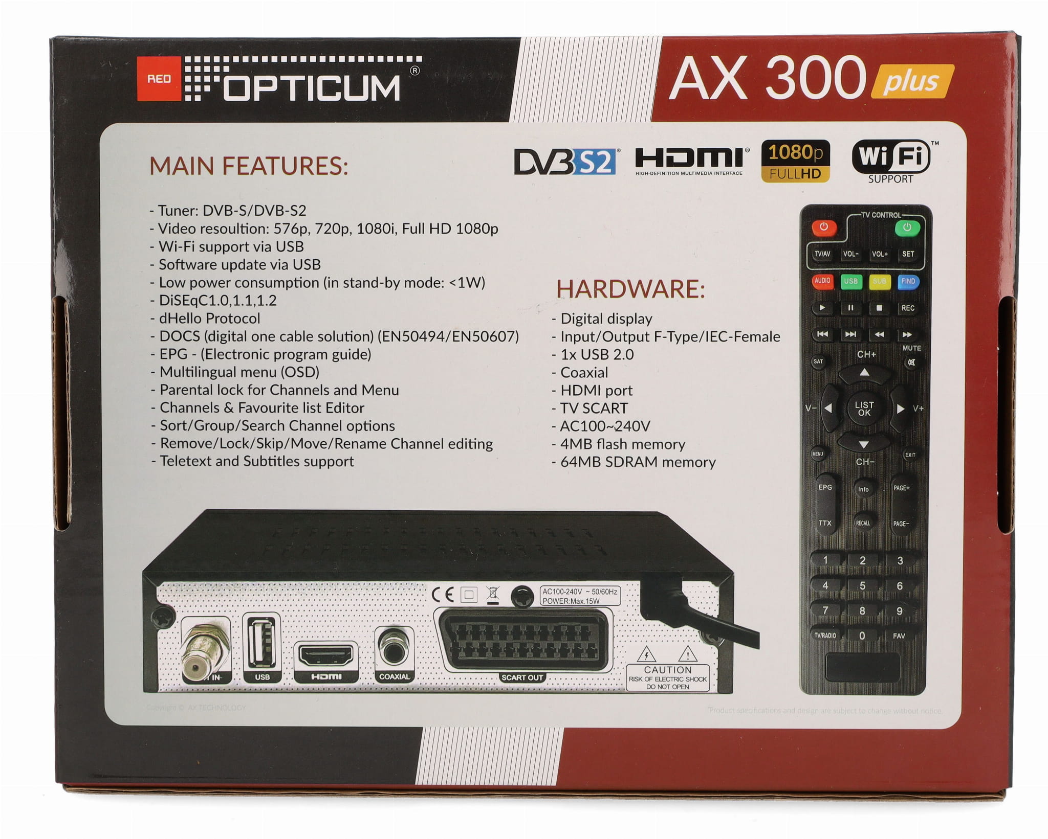 Proste w użyciu menu programowania tunera pozwala na szybkie wyszukanie programów satelitarnych. Tuner Opticum AX300 umożliwia bezpłatny odbiór polskich niekodowanych kanałów FTA takich jak np.: TVP Info, 4fun TV, TV Trwam, TV Polonia, TVP Kultura, TV Puls, TVS oraz wielu kanałów radiowych (m.in. Radio ZET, Polskie Radio, Radio Maryja). Menu ekranowe w języku polskim.