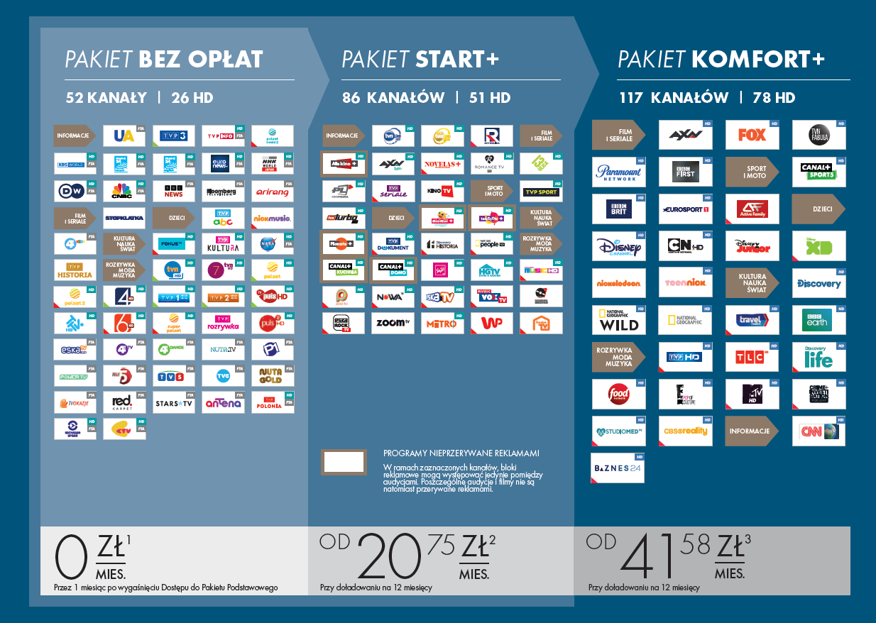 - pozostanie w ofercie "BEZ UMOWY" z dostępem do ponad 100-u kanałów, na zasadach pre-paid (bez zobowiązań) w cenie od 20,75 zł/msc (przy jednorazowym doładowaniu na dwanaście miesięcy);