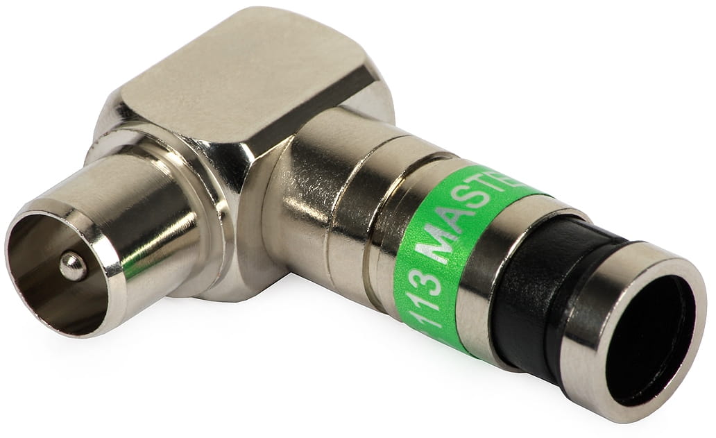 Wysokiej klasy kątowe złącze kompresyjne, marki MASTER. Złącze posiada podwójną kompresje dookolną, gwarantującą perfekcyjne połączenie z kablem. Dokładnie wykonany gwint gwarantuje łatwe wetknięcie na gniazdo antenowe, przy minimalnym tłumieniu. Złącze będące przedmiotem oferty doskonale zastępuje złącza PCT IEC serii 9. Powszechnie używane w instalacjach telewizyjnych (w tym telewizji naziemnej DVB-T i kablowej DVB-C).