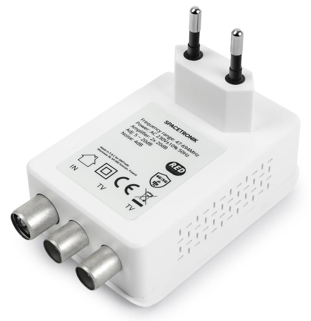 Wzmacniacz pracuje w zakresie 47 - 694 MHz, posiada wbudowany filtr LTE 5G 700,o który eliminuje wszystkie zakłócenia powyżej 700 MHz. Wzmocnienie wynosi do 20dB. Niewątpliwą zaletą urządzenia są małe wymiary i możliwość zamontowania bezpośrednio w gniazdku sieci elektrycznej.
