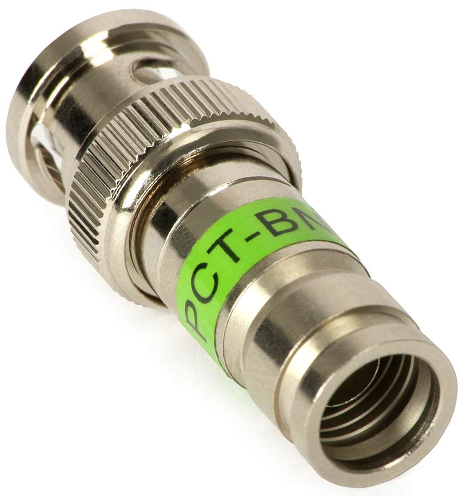 Złącze PCT BNC wykonane jest z mosiądzu pokrytego niklem. Konstrukcja złącza zabezpiecza go i przewód przed wodą bez zastosowania jakichkolwiek uszczelek. Rodzaj użytego materiału gwarantuje brak korozji. Najwyższa precyzja wykonania wpływa na wygląd i jakość połączenia. Prawidłowe zaciśnięcie jest bardzo proste i daje gwarancję poprawnego i stabilnego połączenia przez długi czas.